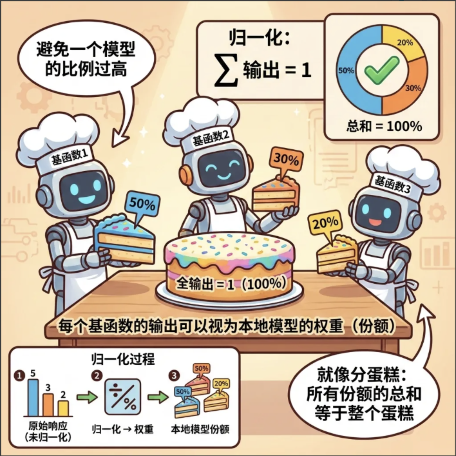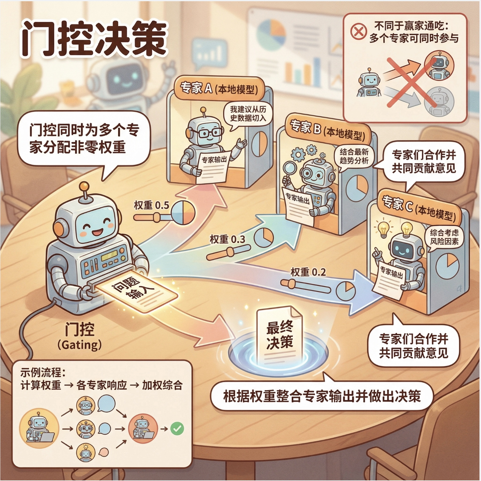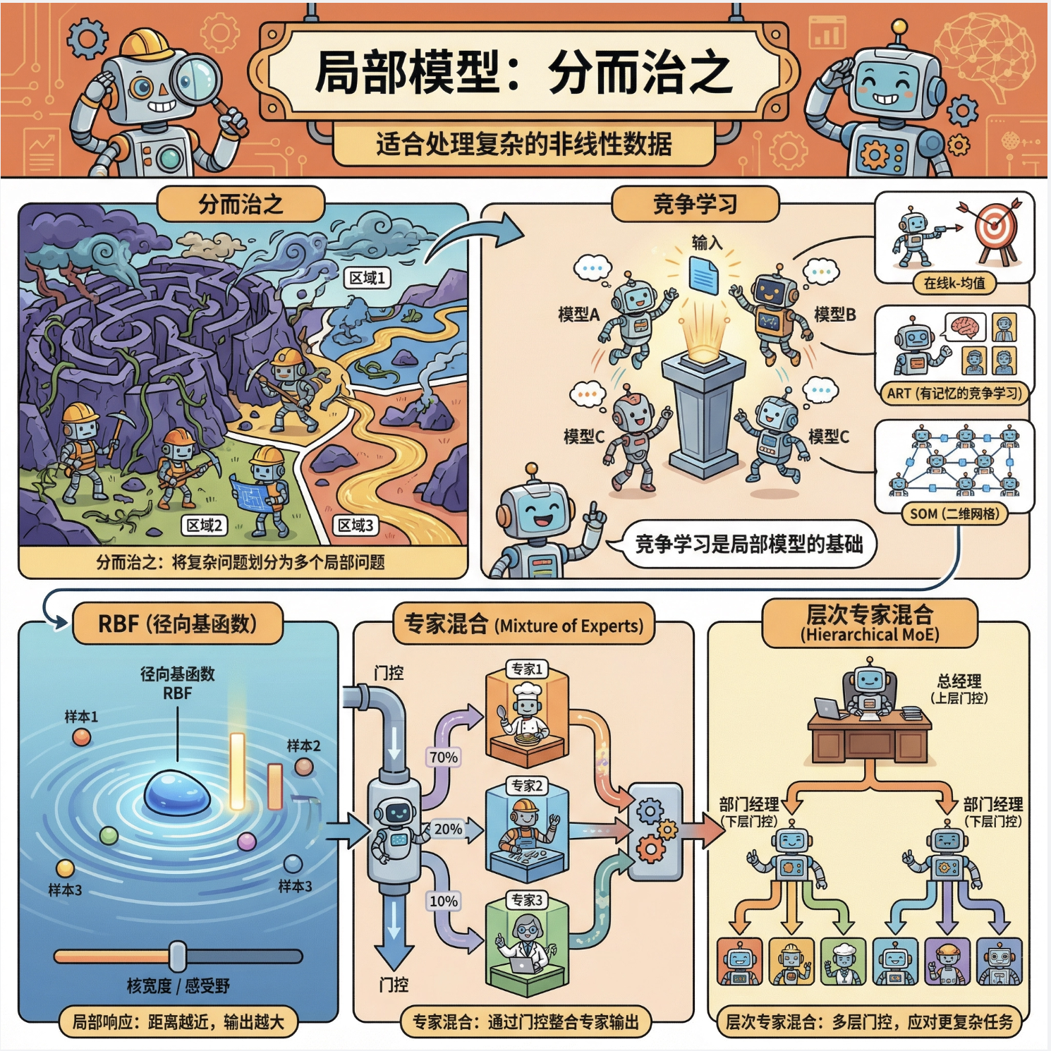 核心比喻 :就像一个公司处理复杂业务,不会让一个员工干所有活,而是分成多个部门(局部模型),每个部门负责一块业务,最后总经理(整合规则)汇总结果。
