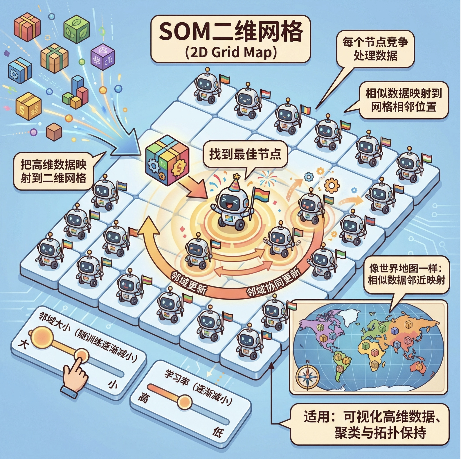 2.竞争学习 :子模型竞争处理数据的权利,包括在线 k 均值(流式聚类) 、ART(带记忆聚类) 、SOM(高维映射);