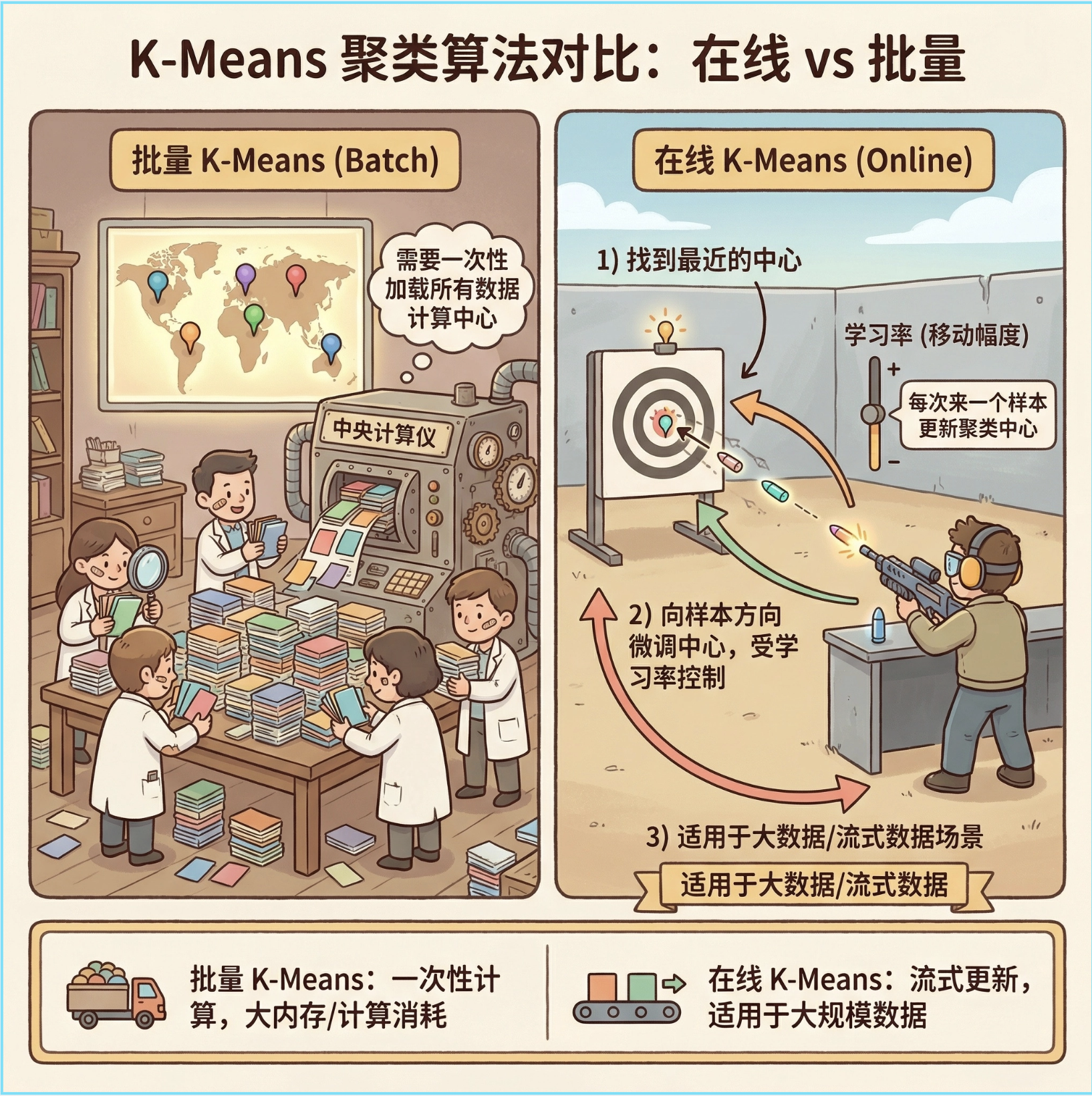 核心思想 :每来一个样本,找到离它最近的聚类中心,然后一点点移动这个中心向样本靠近(学习率控制移动幅度),就像打靶时每射一发就微调准星。