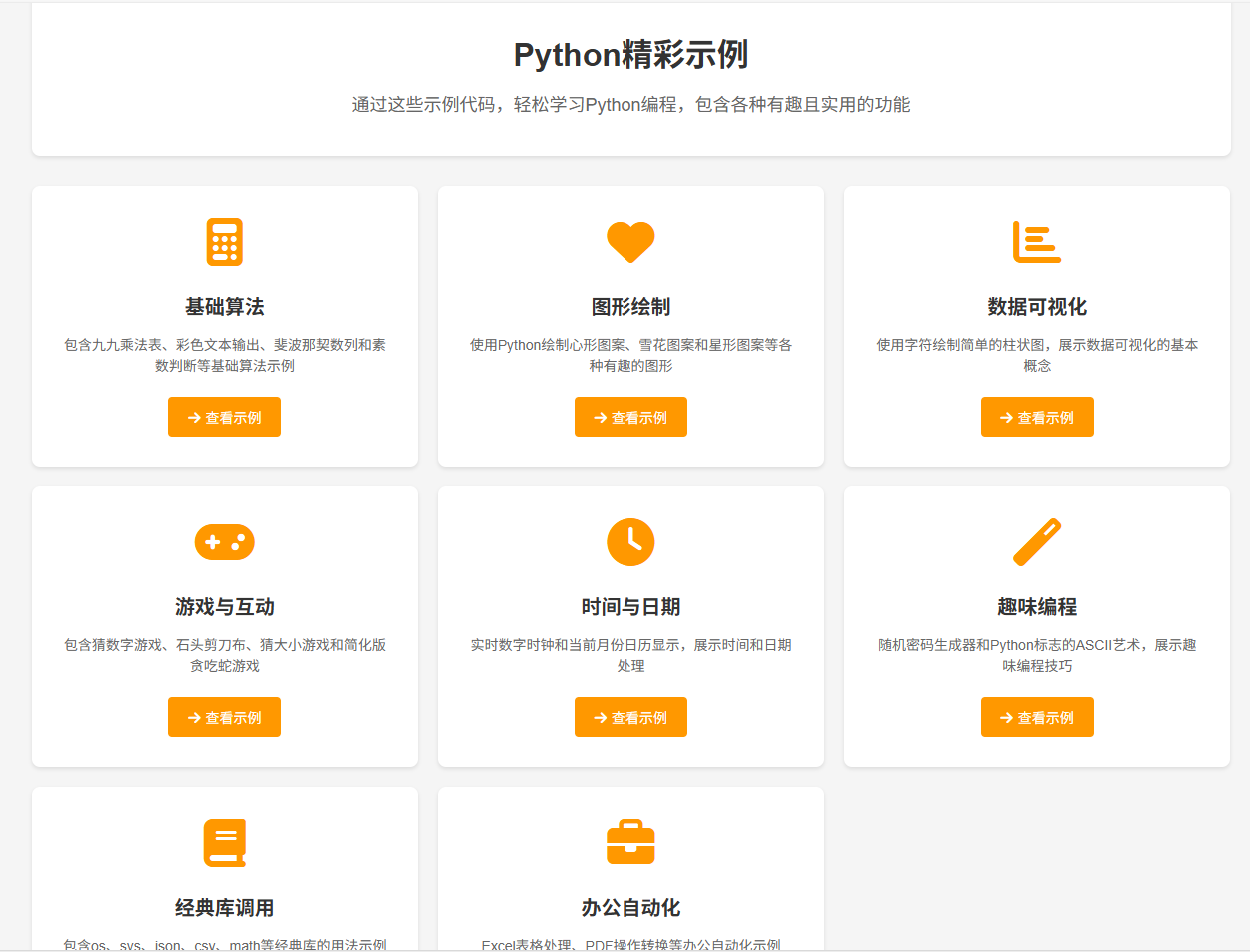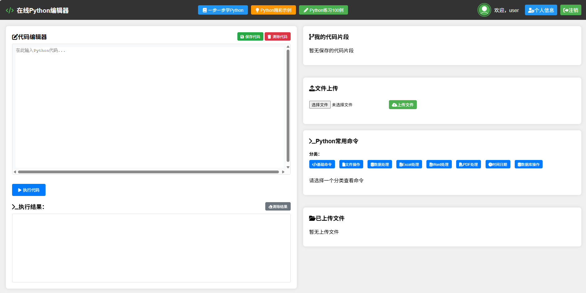 单位里现在主流的数据处理还都是用excel,但是处理起来费时费力还老出问题,他们也经常找我们技术部门的人来处理数据,也对python这个"高大上"的东西很是好奇,但是又有畏难情绪,其实现在AI发展的这么快,别的不说,搞个python代码处理数据那还真是让AI砸了码农的饭碗了,只有想不到没有做不到。为了让他们初步的接触认识python,我就利用AI开发了这么个基于 Flask 的在线 Python 编辑、运行和学习的平台,提供代码编辑、执行、文件管理、示例代码和练习系统等功能,让大家伙不用自己下载安装python就能在网页上先体验一番,还能循序渐进的了解python,学习python。这次大部分的代码都是AI生成的,我只提供创意,不废话了,直接上菜。