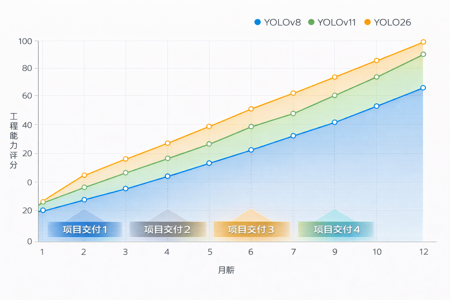 曲线解读:前3月快速建立工程直觉(YOLOv8),4-6月突破精度瓶颈(YOLOv11),7-9月攻克部署难题(YOLO26),10-12月实现产业级交付能力。每个阶段设置明确交付物,避免"学完就忘"。