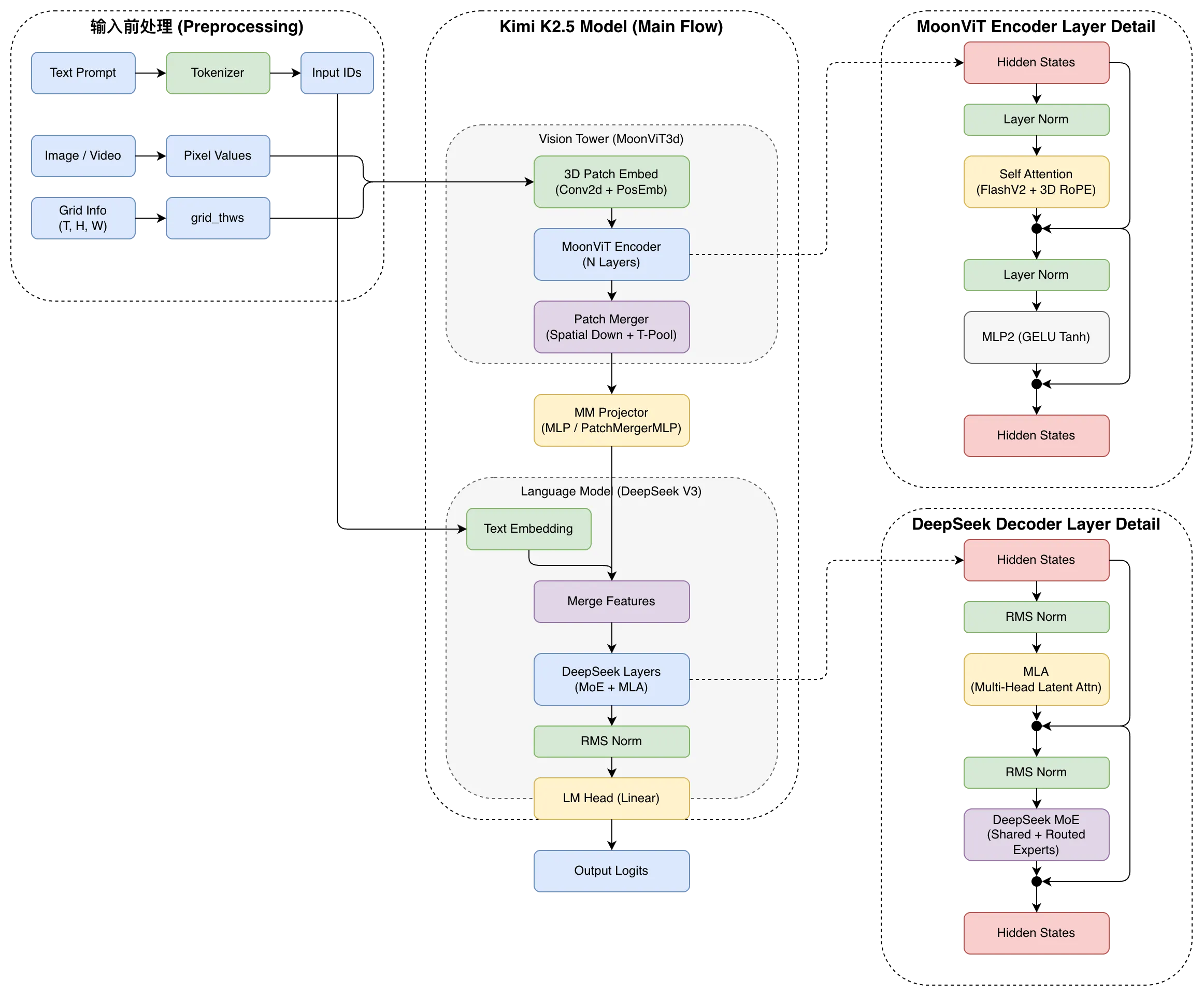 模型主要包含三个部分:MoonViT-3D、MLP投影器、Kimi-K2。没错,刚发现Kimi-K2其实是单模态的,这里面使用的是Kimi-K2的模型架构而非其训练参数。
