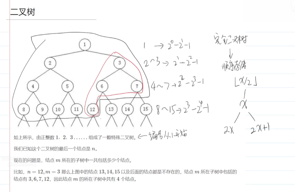比如,n=12,m=3,那么上图中的结点 13,14,15以及后面的结点都是不存在的,结点 m所在子树中包括的结点有 3,6,7,12,因此结点 m的所在子树中共有 4个结点。