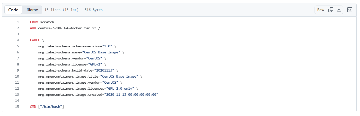 官方的 CentOS 镜像在 Docker Hub 上的公开仓库中,可以直接通过 docker pull centos 获取。其 Dockerfile 可能会涉及很多系统配置和优化,通常它们会放在 GitHub 仓库 或 Docker Hub 的页面中公开,具体内容可以参考 CentOS 官方发布的 Dockerfile,如图: