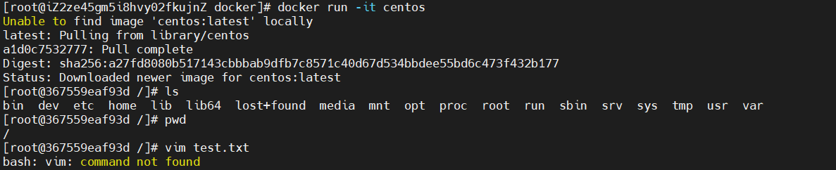 我们下载并运行官方 CentOS 镜像,发现进入容器后会默认进入根目录,且容器内默认无法使用 vim 工具,如图: