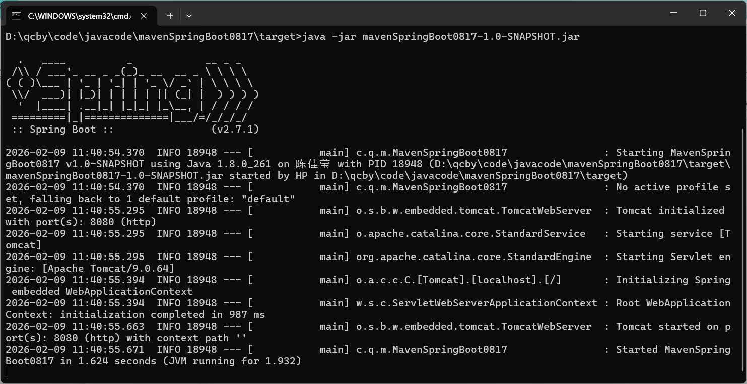 其次需要本地验证,在 JAR 包所在目录下执行命令 java -jar JAR包名称,如图: