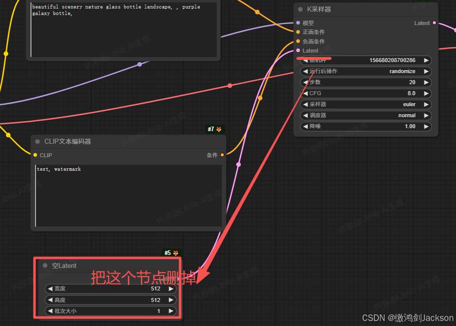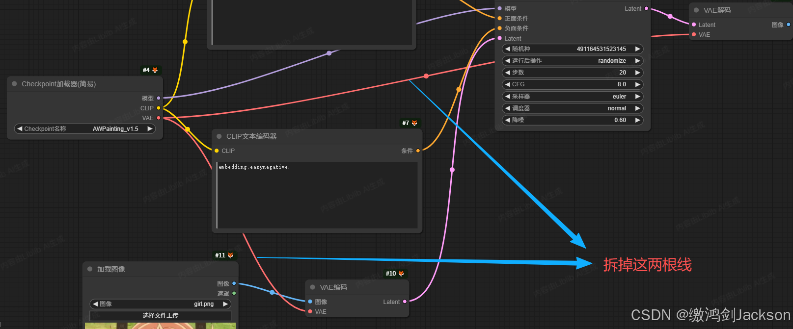 ①先断开VAE编码、VAE解码和Checkpoint的VAE接线头的连线。