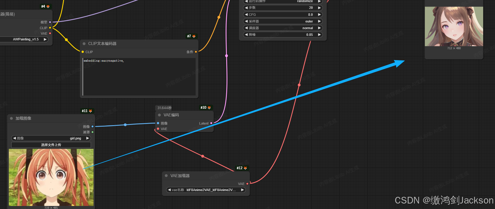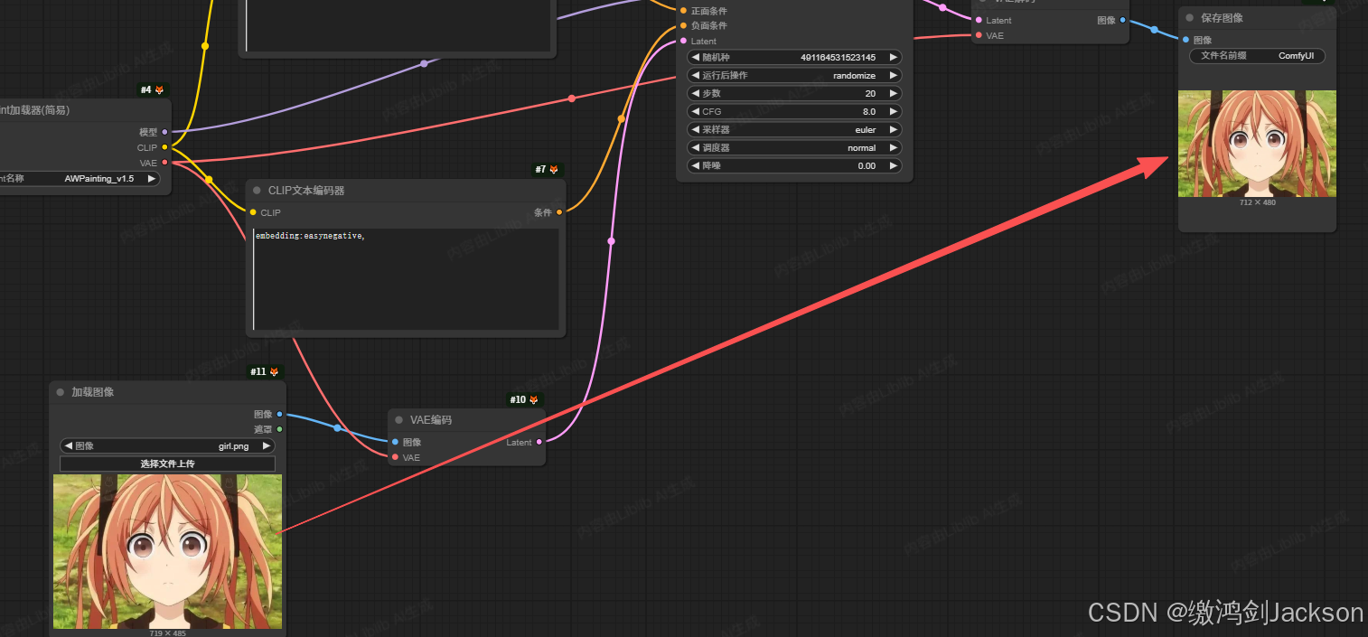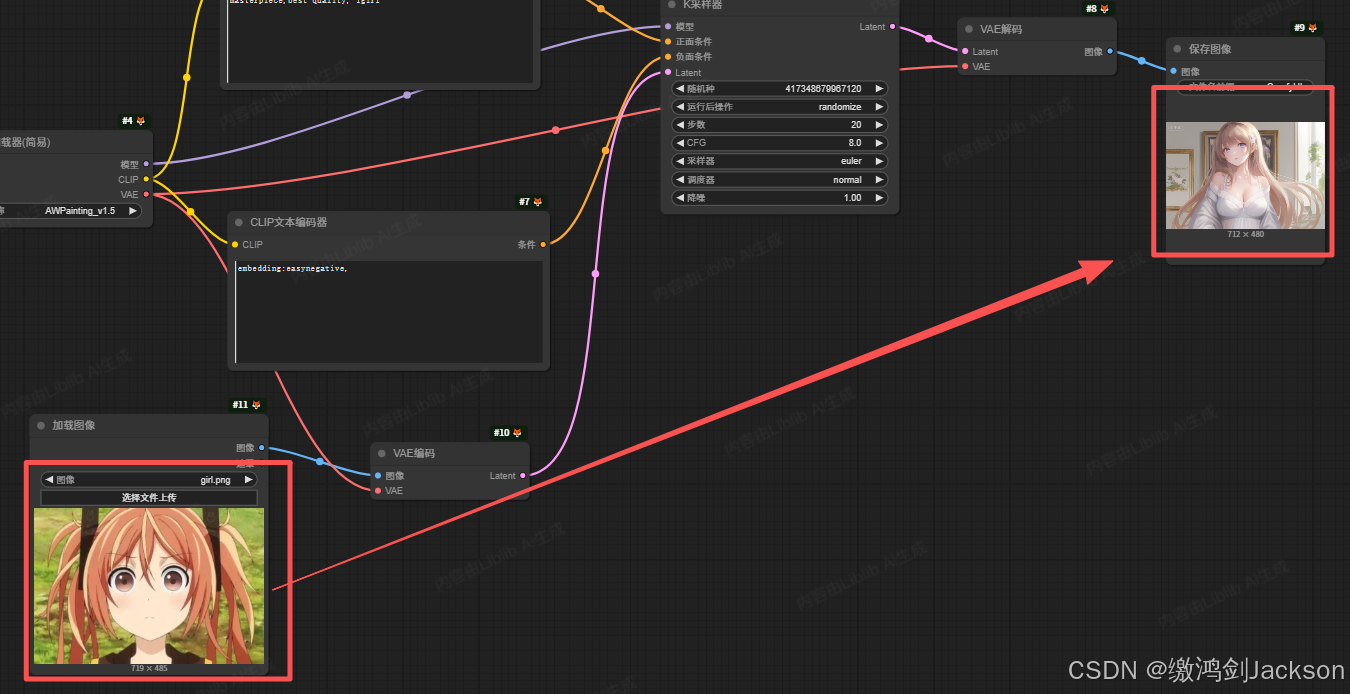 如下图所示,VAE编码、VAE解码,这两个节点,都连着Checkpoint加载器的VAE节点呢,此时用的就是大模型自带的VAE