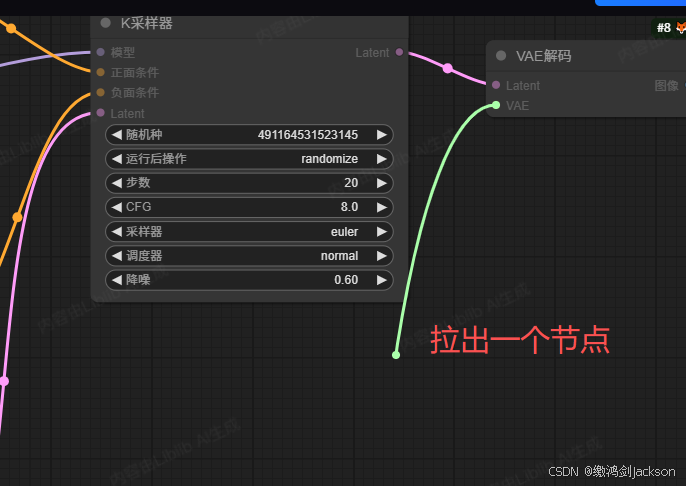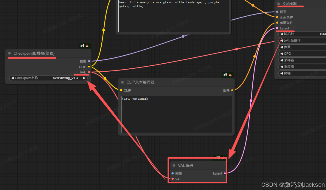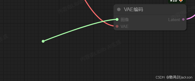 2.从K采样器的Latent接线头,拉出一个新的"VAE编码"节点,并将新VAE编码节点的VAE接线头和Checkpoint相连