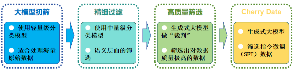 根据不同的项目采用不同的质量过滤方法,不一定按照流程进行。比如医学领域可以直接使用指令微调(SFT)等,进行条件下可以直接使用偏好对齐的方式。