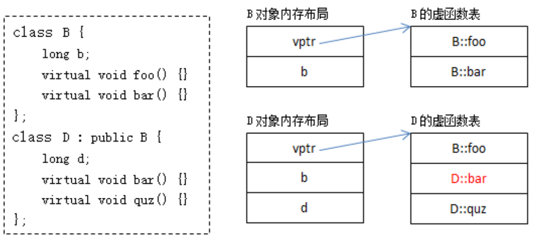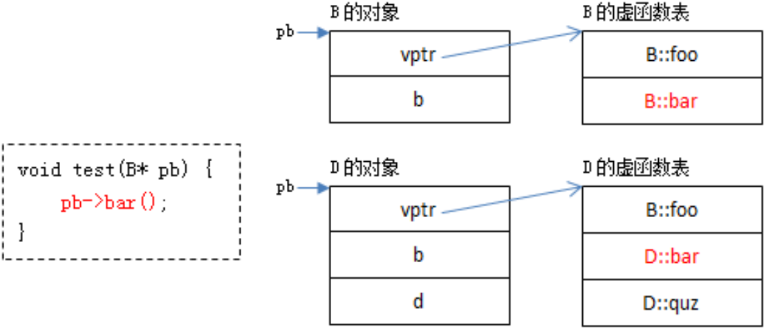 - 当编译器编译以下test函数时只知道pb是B*类型的指针,并不知道它指向的具体对象类型 :pb可能指向的是B的对象,也可能指向的是D的对象。