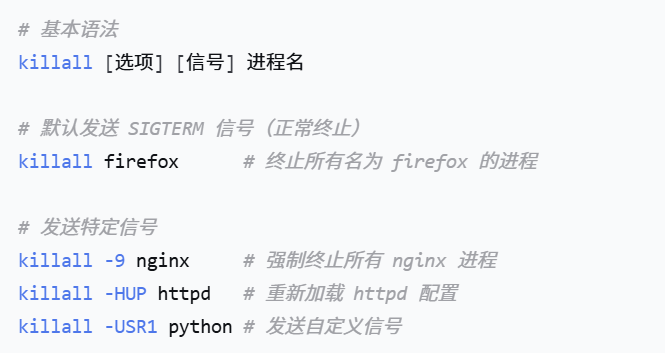 是 Linux/Unix 系统中用于按进程名发送信号的命令。它可以根据进程名称(而不是进程ID)向多个进程发送信号