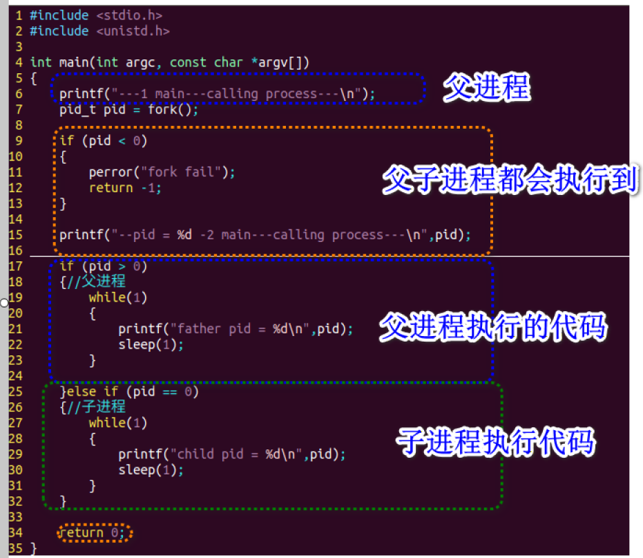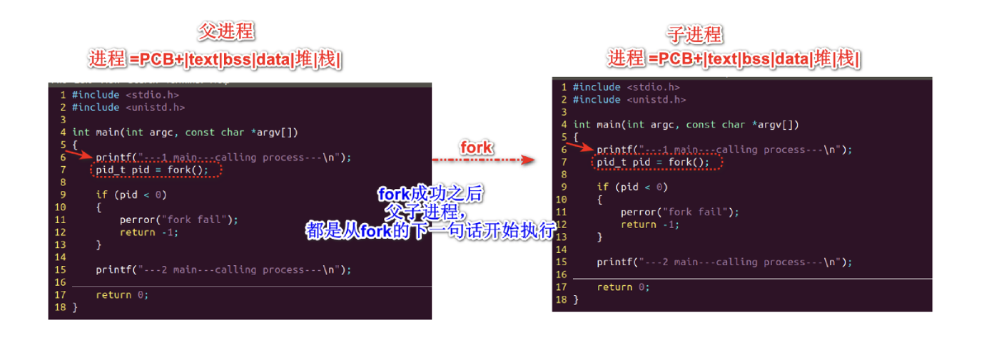 - fork成功后,父子进程都是从fork的下一句开始执行的