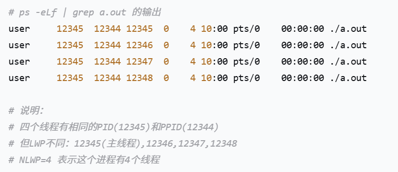 查找名为 a.out 的进程及其所有线程的详细信息。