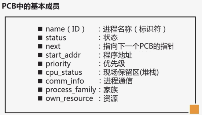 是操作系统用来描述进程的各种信息的数据结构,它包含了进程的标识符、状态、优先级、CPU 寄存器信息、内存管理信息等。PCB 是进程存在的唯一标志,操作系统通过 PCB 来感知和控制进程。(Linux中为task_struct)