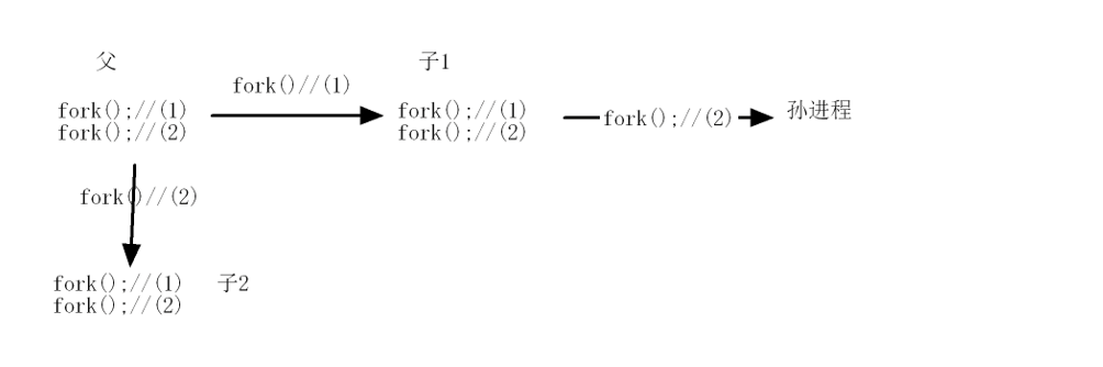 会生成3个新进程:两个子进程,一个孙进程。加上调用进程就有四个进程