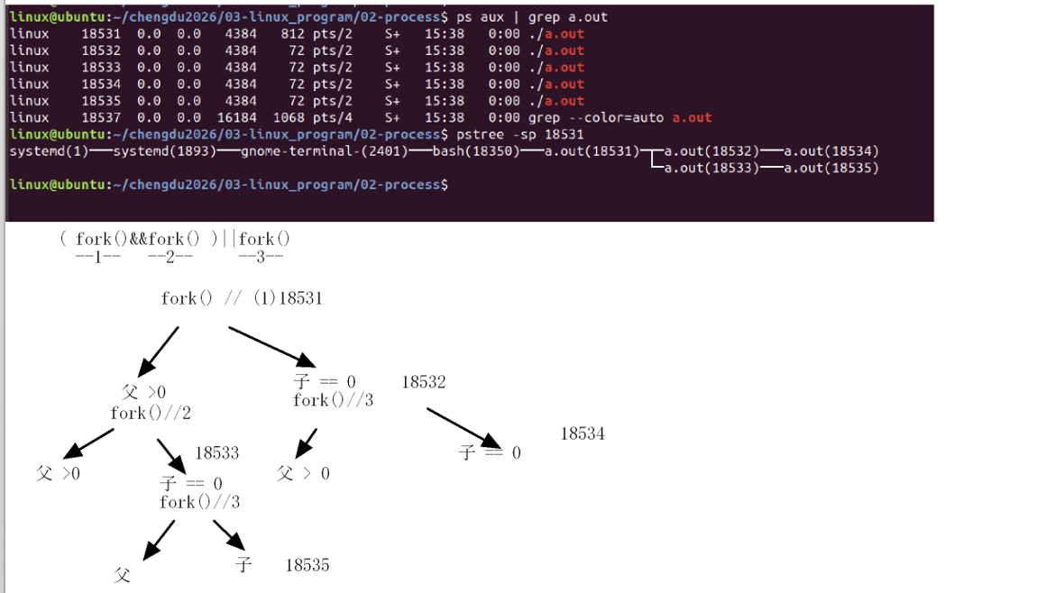 一次 fork() 调用会生成 2 个进程:原有的父进程和新创建的子进程