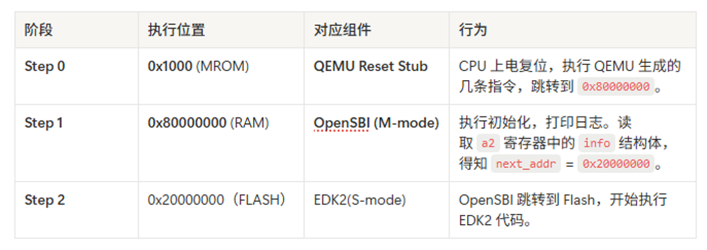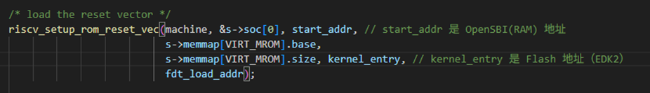 关键结果: kernel_entry被强制修改为 Flash 的基地址 (0x20000000)。这意味着 QEMU 决定:OpenSBI 运行完后,应该去执行 Flash 里的代码 (EDK2)。