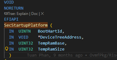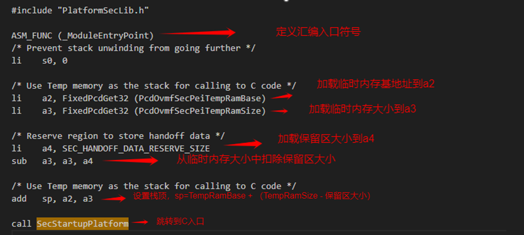 - TempRamBase(a2)和 TempRamSize(a3)在汇编入口里由 PCD 读取并写入,然后调用 SecStartupPlatform()。