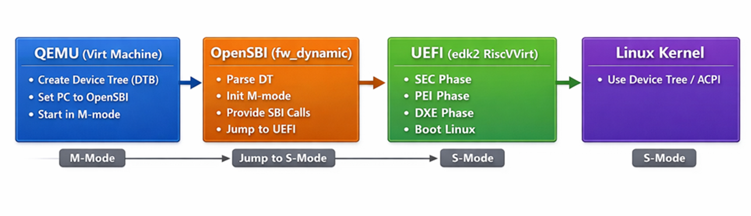 - UEFI 运行在 S-mode ,是平台与 OS 之间的标准化系统固件,负责把"平台差异"收敛成统一接口(UEFI,向 OS 提供 ACPI 或 DT)
