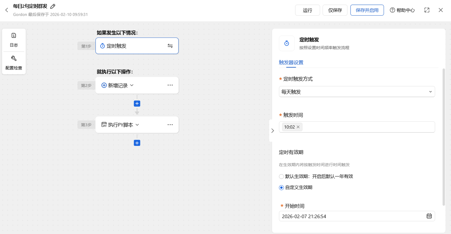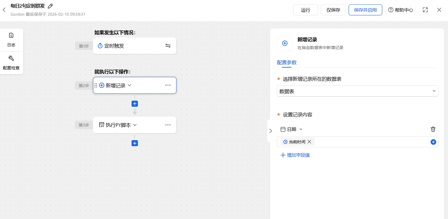 接下来,新增时间记录,执行PY脚本,并传入当前新增记录ID,这样代码就可以把每日英语写入到上一步的新增记录里。最后还要点击【保存并启动】,启用当前流程。