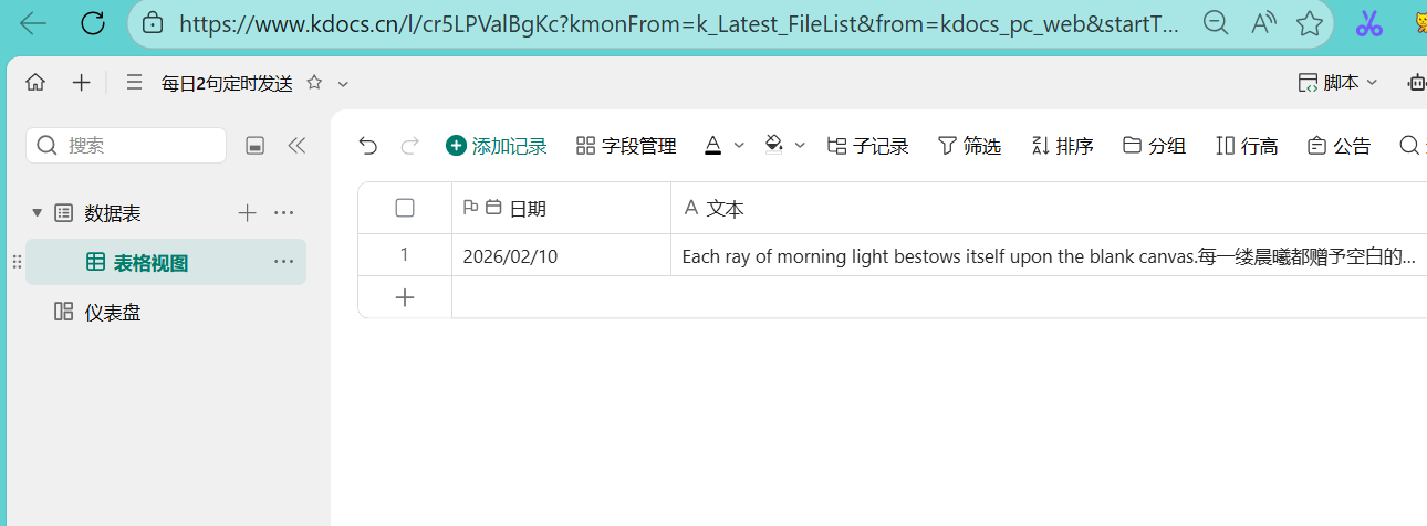 这样每天固定时间,如9:00,WPS多维表就会定时增加一条记录,然后PY脚本【每日2句发送】就会自动执行,爬取网上的每日英语,并写入到多维表中。
