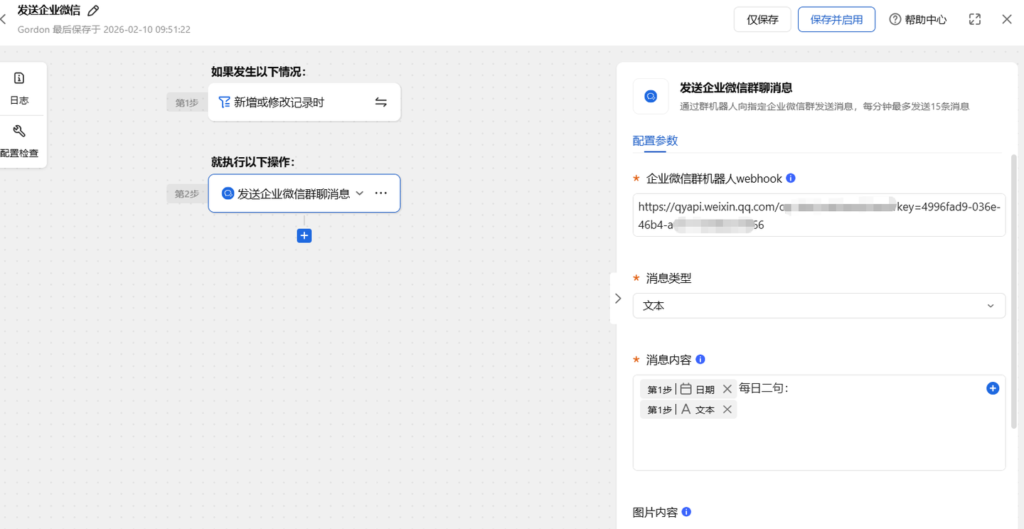 在发送企业微信群消息期间,填写在2.1部分获取的webhook地址,消息类型选择为文本。
