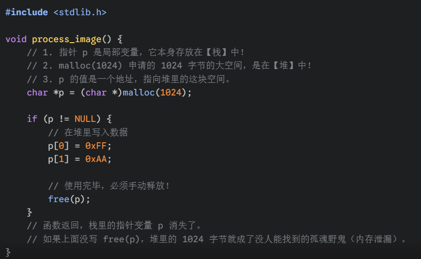 // 如果上面没写 free(p),堆里的 1024 字节就成了没人能找到的孤魂野鬼(内存泄漏)。