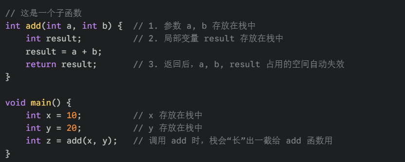 int z = add(x, y); // 调用 add 时,栈会"长"出一截给 add 函数用