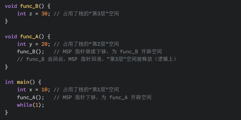 真相 :在裸机中,整个程序只有一个巨大的栈空间(就是上面定义的那 1KB)。