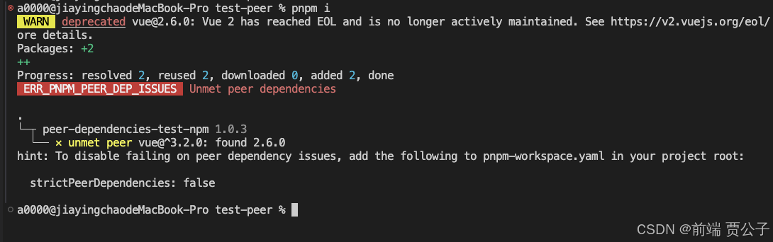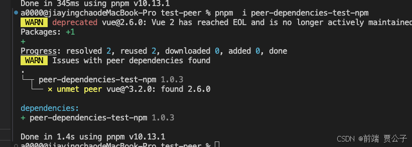 如果不同软件包对某个依赖项的版本要求存在冲突,pnpm 不会自动安装任何冲突的依赖项版本,而是会打印一条警告信息。比如说我们上面测试项目中的宿主环境的 Vue 版本是 2.6.0,但 peer-dependencies-test-npm 包中的依赖要求的是 vue@3.2.0 则这些要求相互冲突,不会进行自动安装。