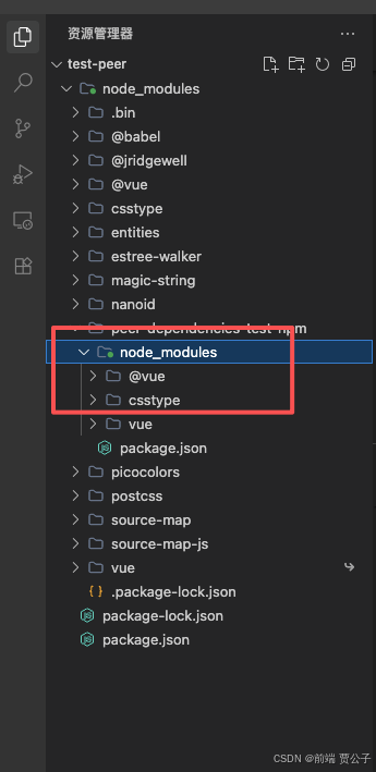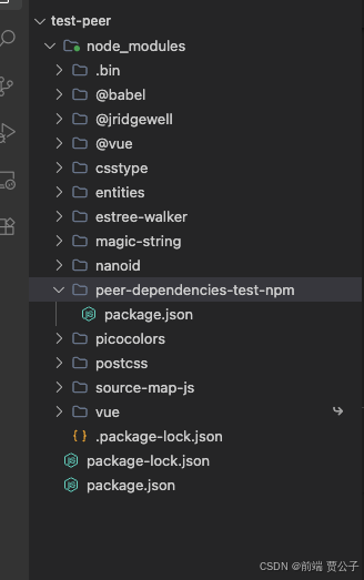 接着我们安装我们上面发布到 npm 的包 npm install peer-dependencies-test-npm,安装完之后我们发现node_modules 目录下的 peer-dependencies-test-npm 目录中还存在 node_modules 目录,目录中的内便是 Vue 相关的包目录。
