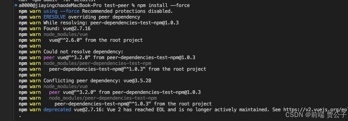 这里有一点需要注意的是,我们使用 --legacy-peer-deps 或者 --force 进行安装,只是以 npm v4 ~ v6 的方式进行安装,**npm v4 ~ v6 的方式就是当有 peerDependencies 声明的依赖发生冲突时,以宿主环境的依赖为准进行安装,**所以即便安装成功,也不一定代表你的项目能正常运行。