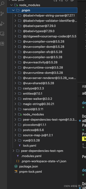 这个时候我们便可以看到根目录 node_modules 下的 .pnpm 文件中多了 Vue 相关的依赖包了。也就是当在进行 pnpm install 的时候,会自动安装 peerDependencies 中的依赖