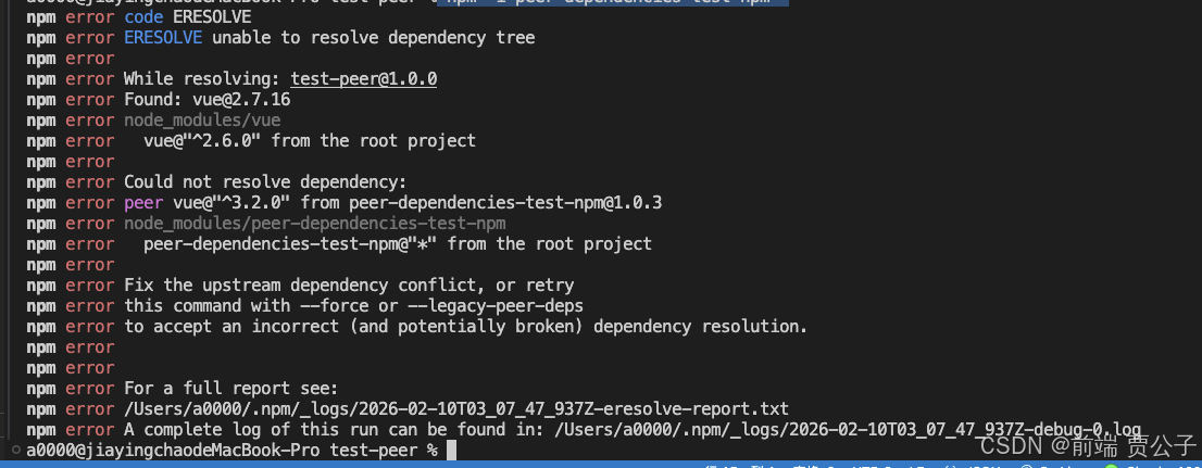 我们发现在此种情况下安装的话会报错了。所以我们可以得出结论:在 npm 7 + 中,如果存在无法自动解决的依赖冲突,将会阻止安装并抛出错误。