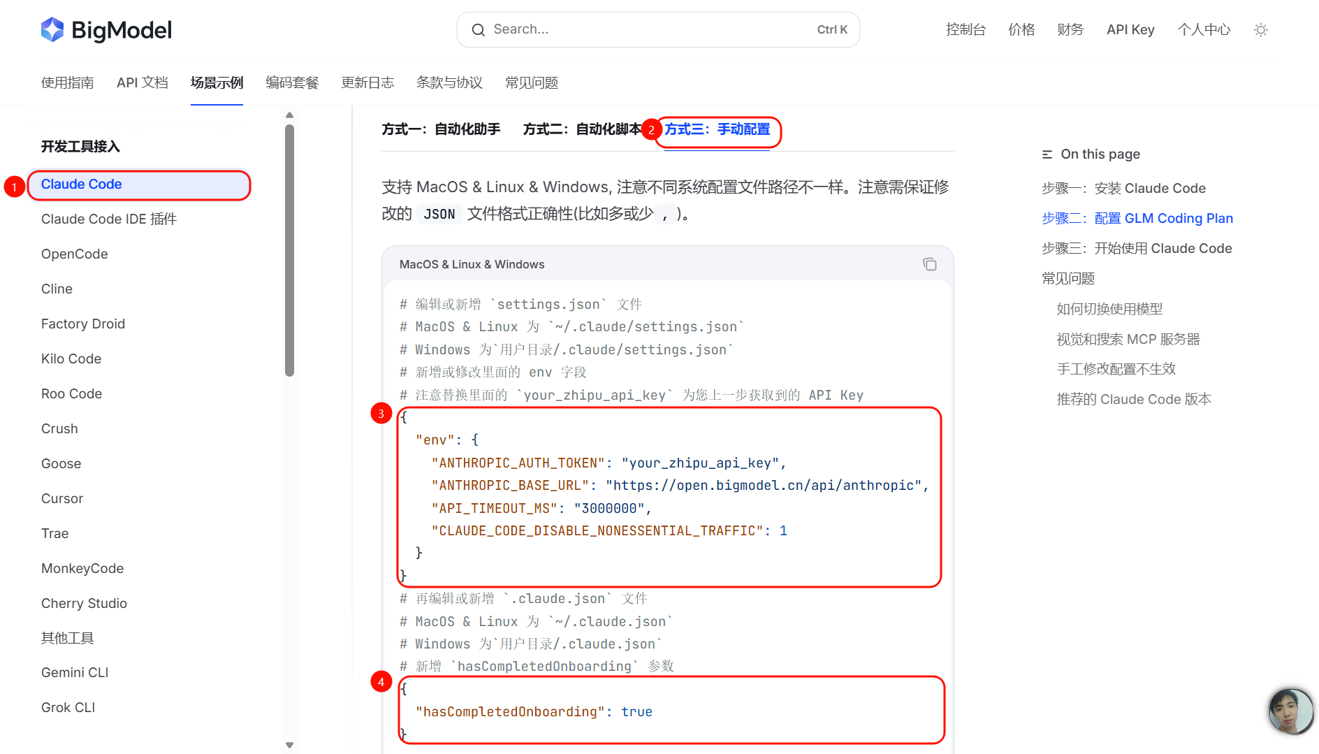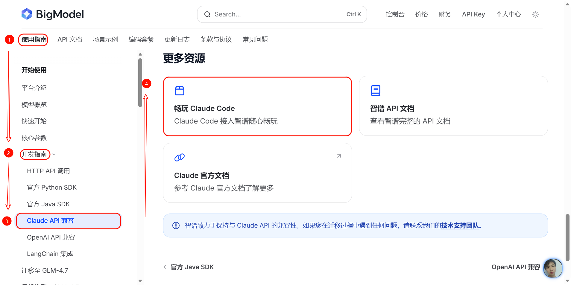 在开发指南里,找到并点击:Claude API 兼容(在使用指南 / 开发指南分类下)