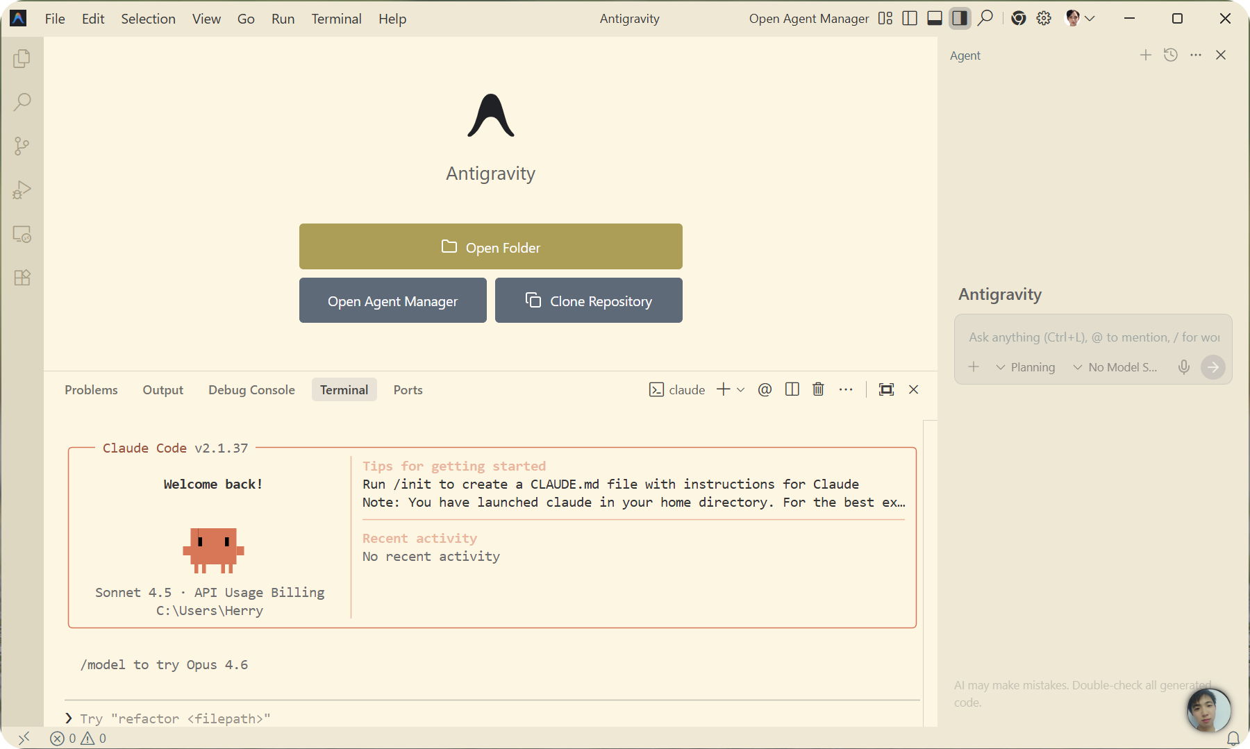 打开Google Antigravity,在Terminal中输入Claude,回车,继续按下 回车键(Enter) 确认选择「1. Yes, I trust this folder」。