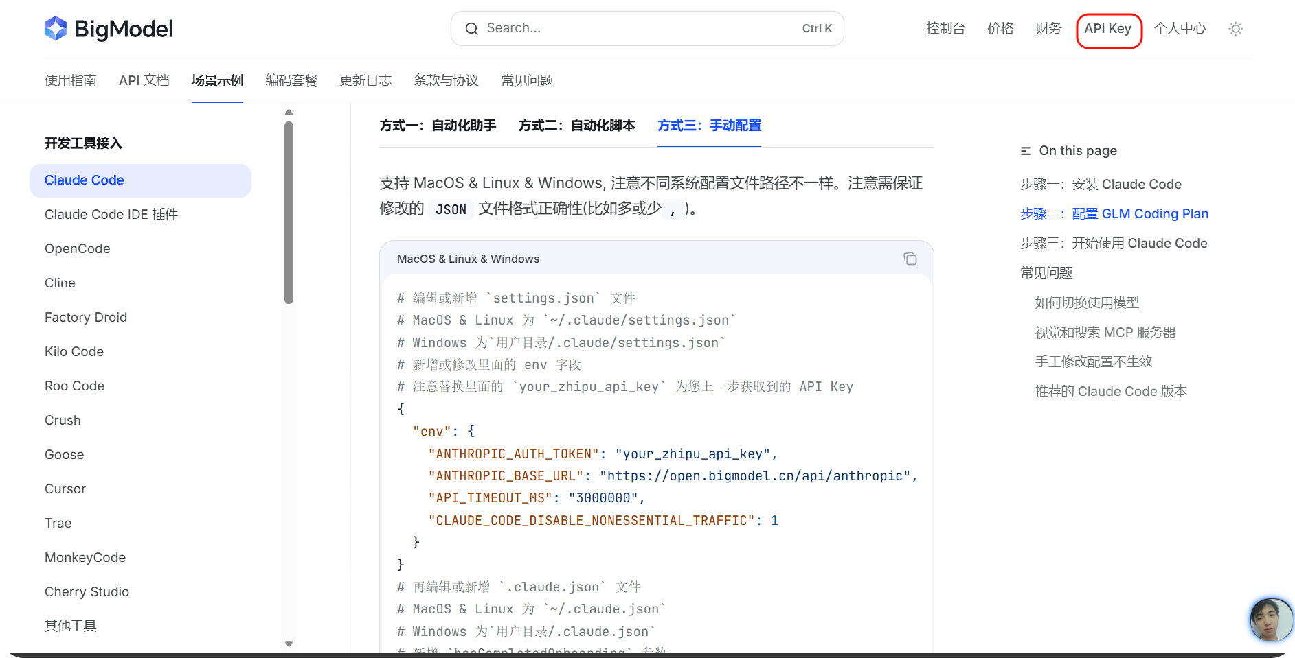 "ANTHROPIC_AUTH_TOKEN": "替换成你的智谱API Key",