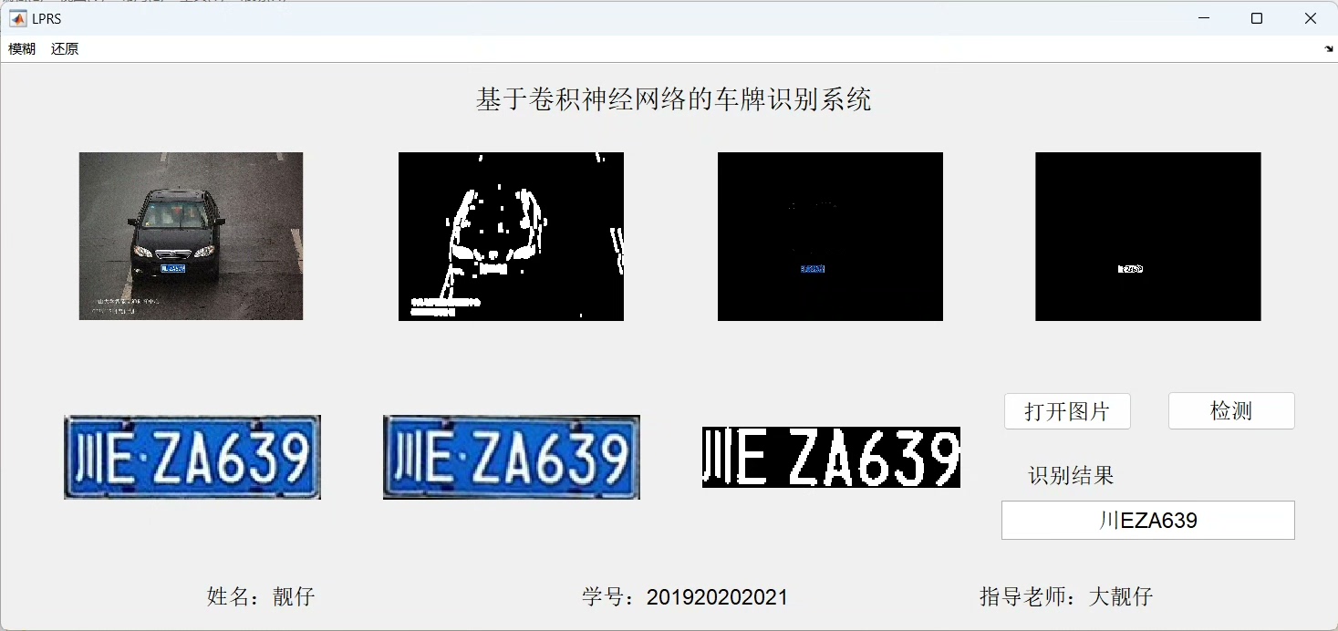 - 标题:基于卷积神经网络的模糊车牌识别系统 - 关键词: matlab GUI界面 模糊 还原 维纳滤波 最小二乘法约束滤波 数字图像预处理 定位车牌 字符分割 卷积神经网络识别 - 步骤: 打开图像 模糊 还原 灰度化 阈值化 边缘检测 孔洞填充 形态学操作 滤波操作 粗定位 精定位 字符分割 卷积神经网络识别 - 简述: 使用matlab gui界面进行操作,可对车牌进行模糊并进行复原操作,最