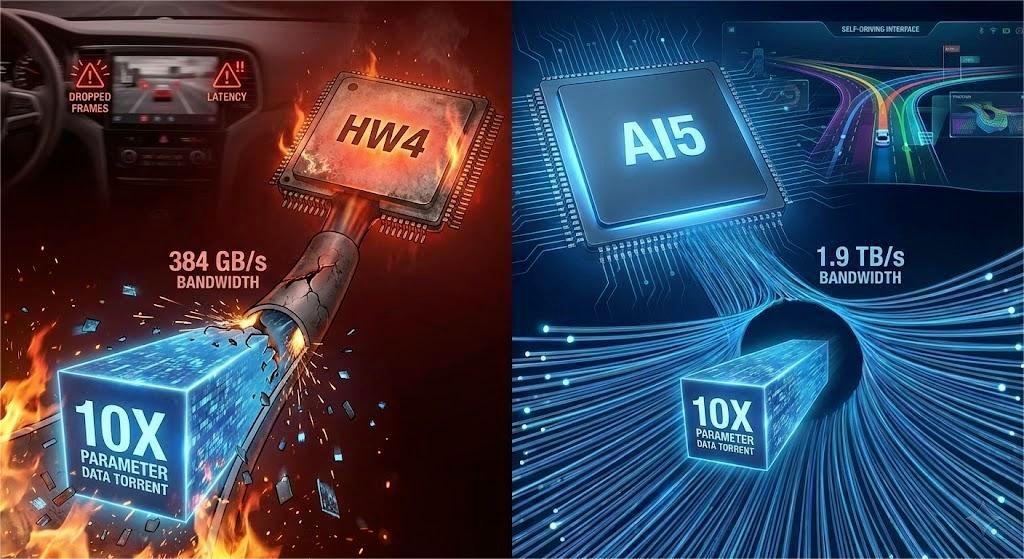 模型再大 10 倍呢?每秒 3.75TB。HW4 的带宽无法支撑这样的规模。AI5 的 1.9 TB/s 带宽,就是为这个准备的。