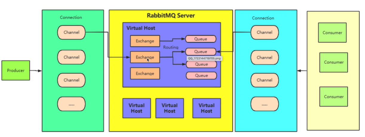 在rabbitmq的服务器上有多个虚拟机,每个虚拟机 之间的资源是不互通的,虚拟机里面有exchange交换机和queue队列,queue用来存储和转发消息,exchange是用来绑定多个消息队列。queue中消息先存在内存,然后批量刷盘(比如1s刷盘一次)
