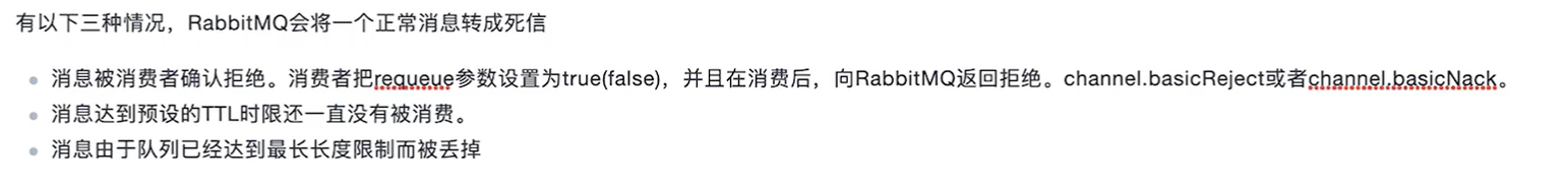 - 拒绝的消息会进入死信队列,定义一个消费者监听死信队列,会收到这条消息。