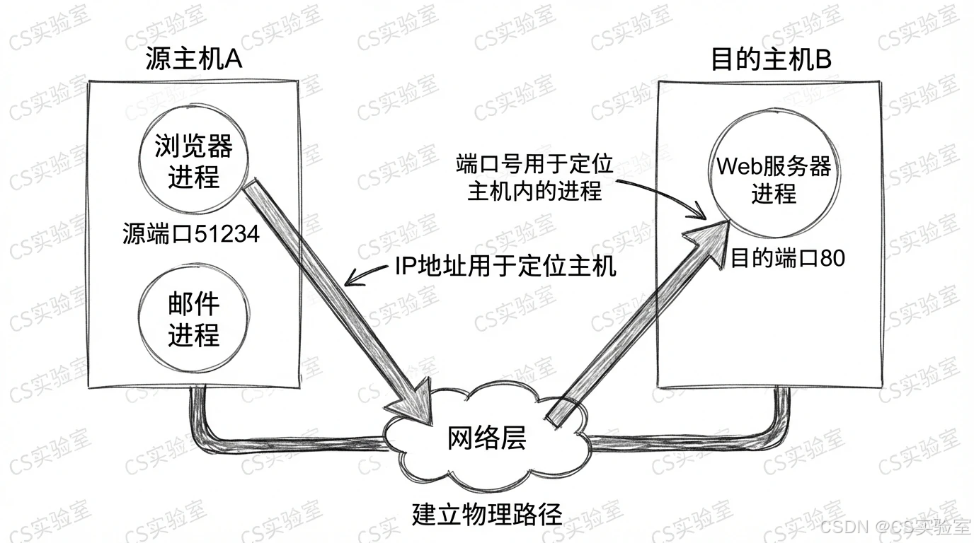 操作系统如何知道接收到的数据包应该交给哪个进程处理呢?仅凭IP地址显然是不够的。传输层引入了"端口号"(Port Number)的概念来解决这个问题。