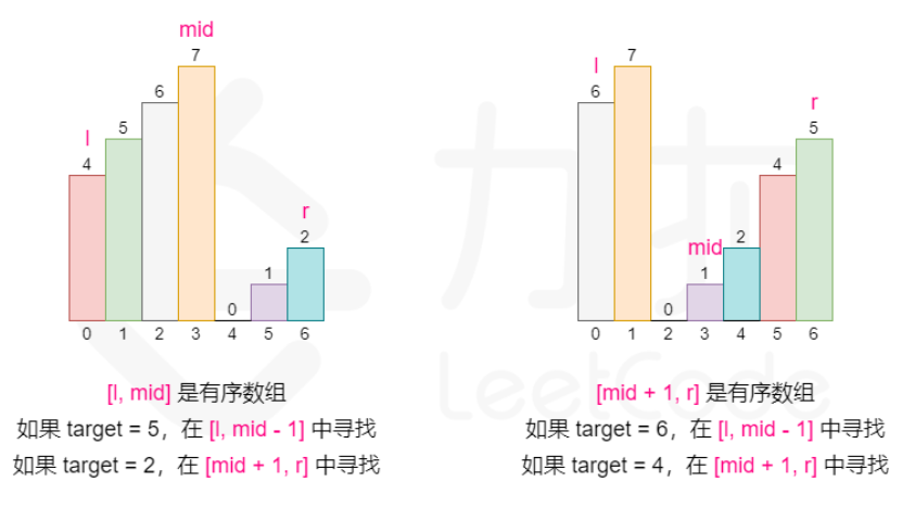 // 例如:[4, 5, 6, 7, 0, 1, 2],mid 在 7 的位置,左边 [4, 5, 6, 7] 是有序的