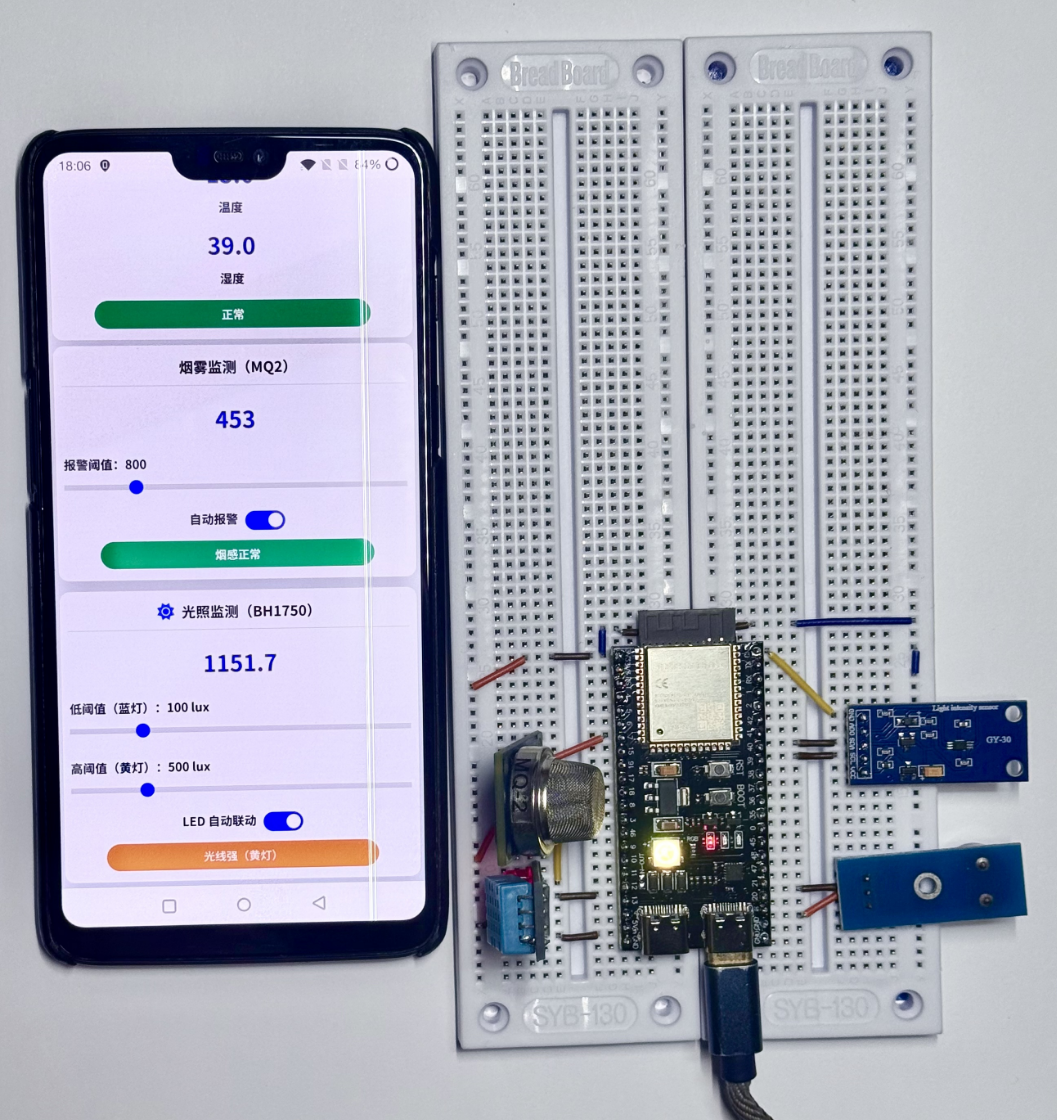 | 前端交互 | 1. 实时显示传感器数据;2. 调节烟雾 / 光照阈值;3. 开关自动联动功能;4. 状态可视化提示 |