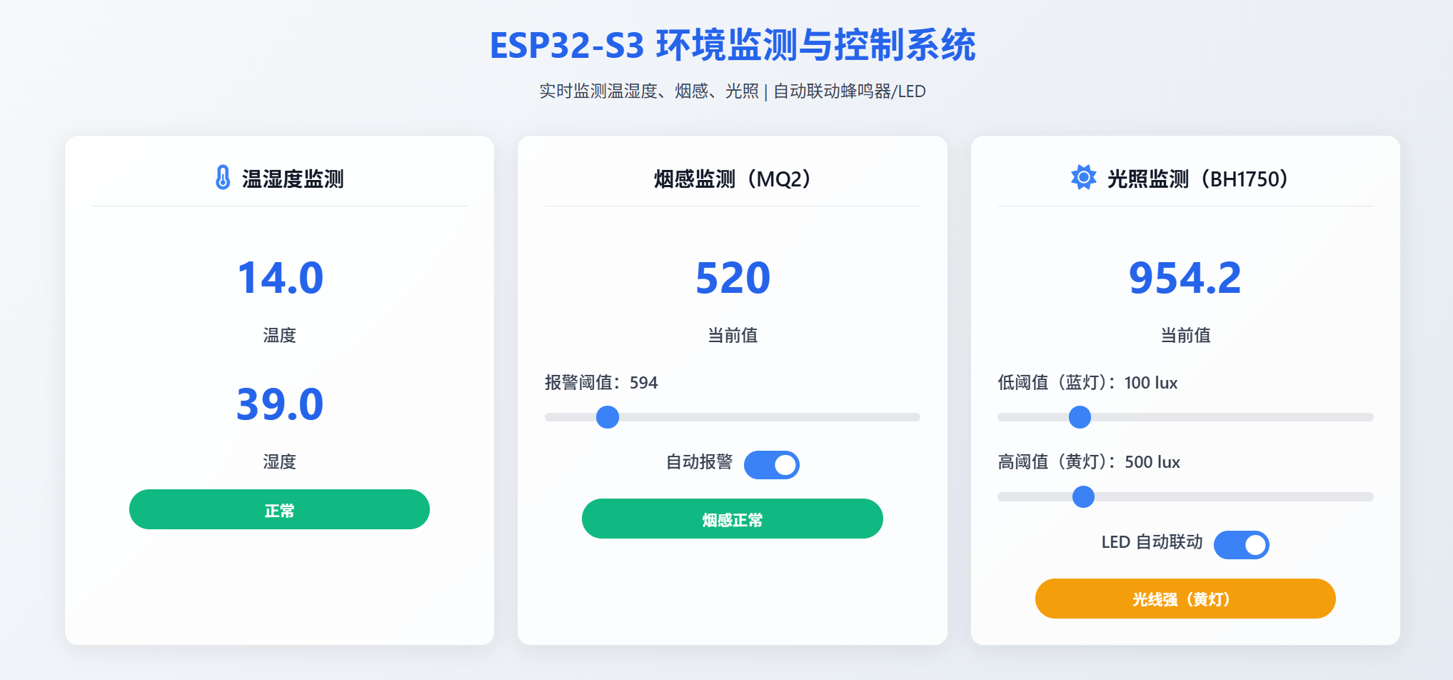 基于 ESP32-S3 开发板和 Arduino 框架,结合 ESPAsyncWebServer 实现一个本地环境采集与控制系统,包含温湿度、烟感、光照监测,以及蜂鸣器、WS2812 LED 联动控制,设计符合现代 UI 交互的 Web 界面。