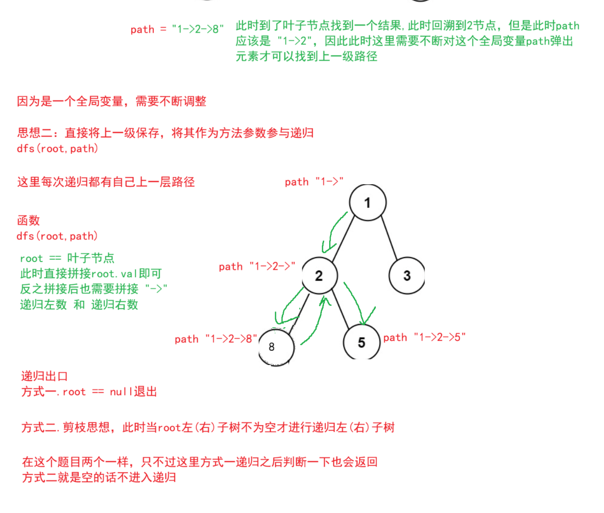 思想:递归进行拼接字符,到叶子节点就将其拼接到结果上,但是此时要注意保存上一级的路径