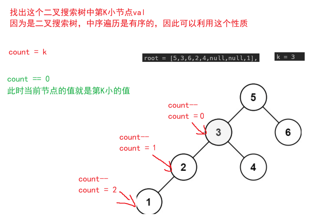 思路:和上一题一样,只不过这里需要一个count遍历来找出其第K小元素,每遍历一个节点count--,直到count == 0,此时这个节点就是要找的元素