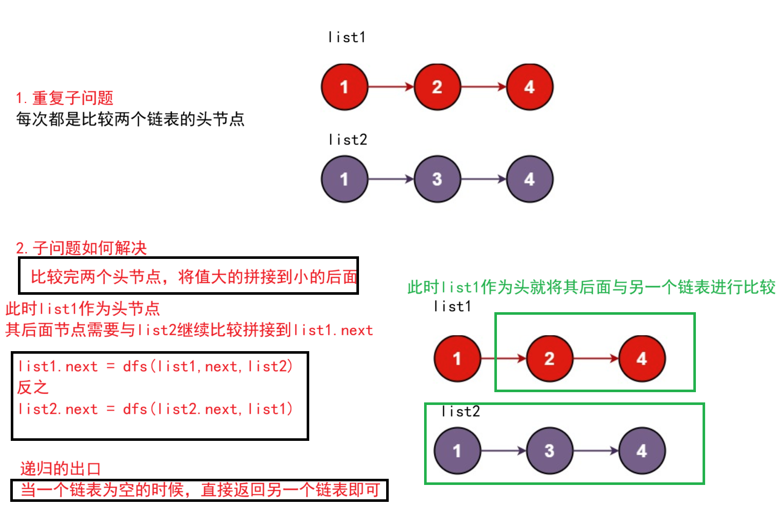 思想:递归可以简单发现每次都是比较两个链表的头节点的val,那个小就拼接后面,因此如果此时 list1.val < list2.val list1.next = dfs(list1.next,list2)即可另一个同理