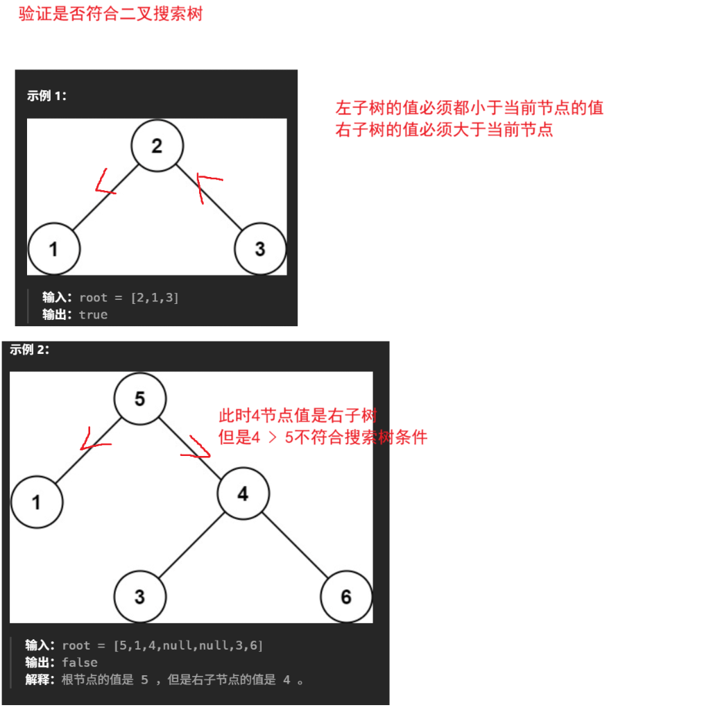 题目解析 :一个树的左子树的值 < 当前节点值 < 右子树的值,那么这棵树满足二叉搜索树的条件
